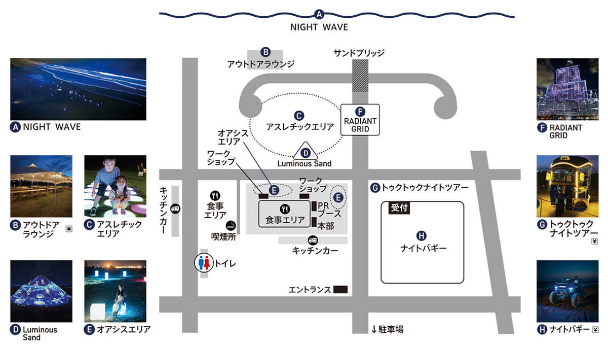 白波を青く染める「NIGHT WAVE」、足場を使った巨大な光の城「RADIANT GRID」、砂浜をキャンバスにした「Luminous Sand」など、先進のインスタレーションが夜の海辺を彩ります。