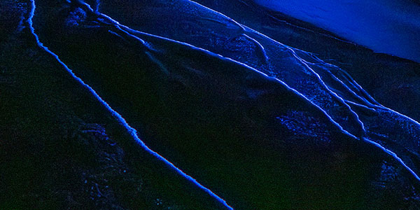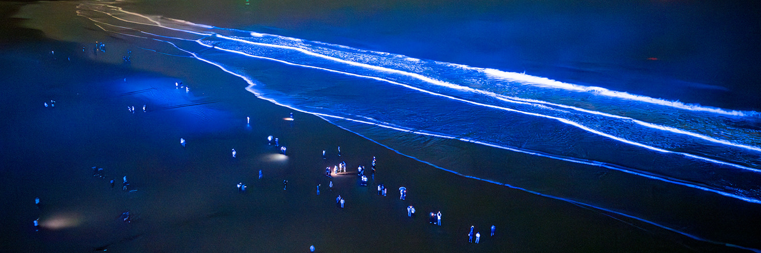 海岸に打ち寄せる波を、幻想的な一筋の光として描き出すメディアアート。